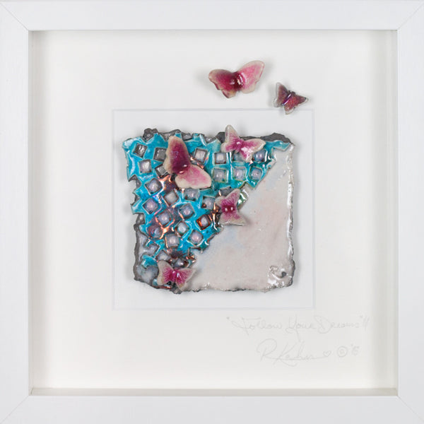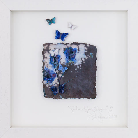 Stunning mellow blues and turquoise with a slight touch of rose/bronze and oil slick metallics on a truly 'PURE' raku fired background! To me this is what raku is all about! Where the smoke penetrates the clay during the firing, to give these wonderful matt slate, greys and soft black finish!