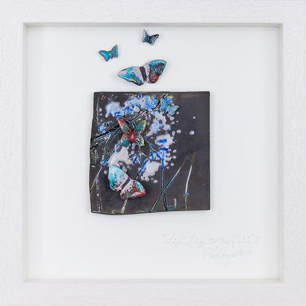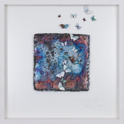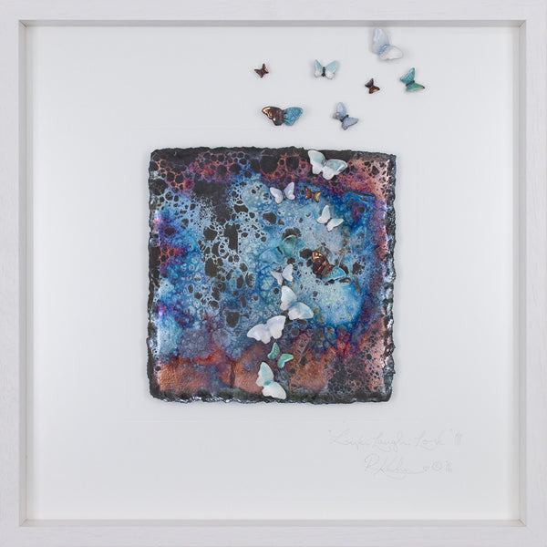 This piece has the most stunning array of multiple colours in it's oil slick metallics on a truly 'PURE' raku fired background! To me this is what raku is all about! Where the smoke penetrates the clay during the firing, to give these wonderful matt slate, greys and soft black finish! With all of it's colours this piece will very easily work with any colour scheme!