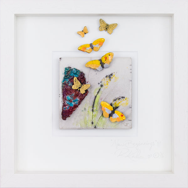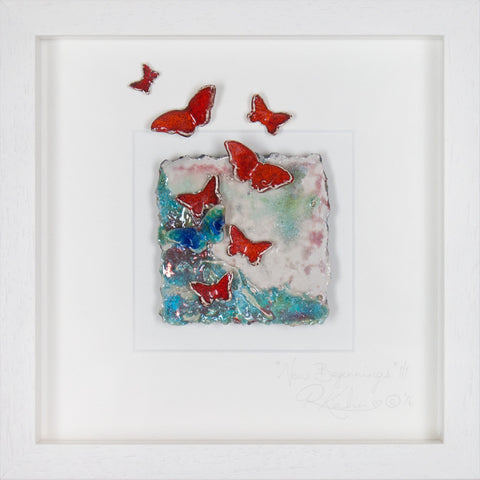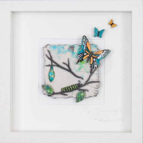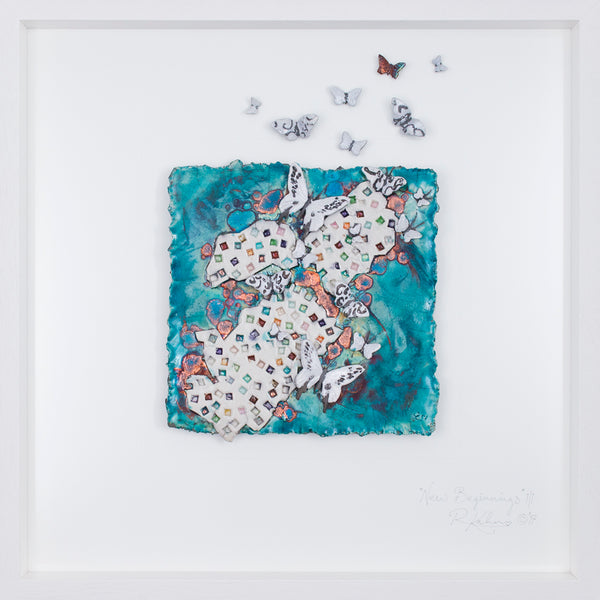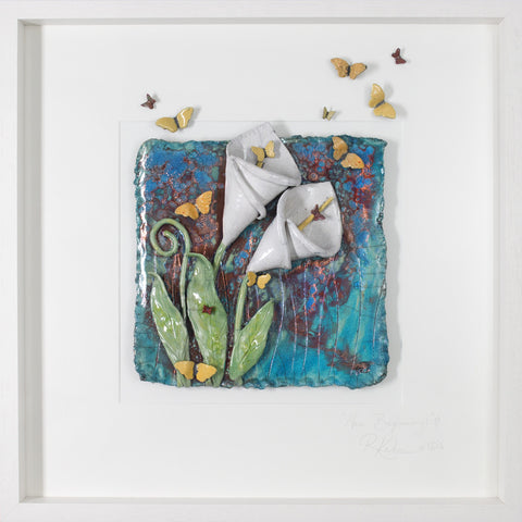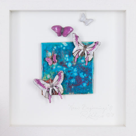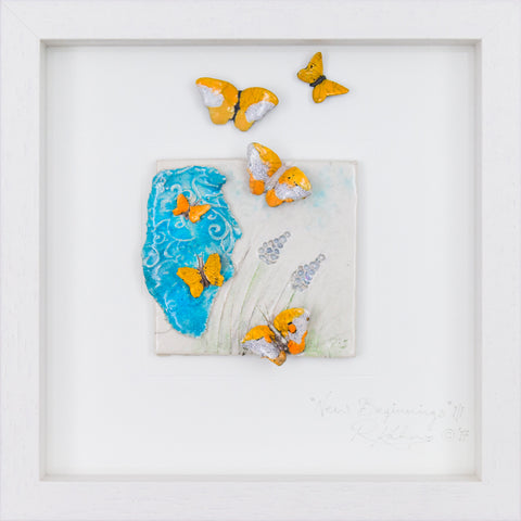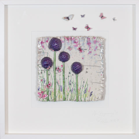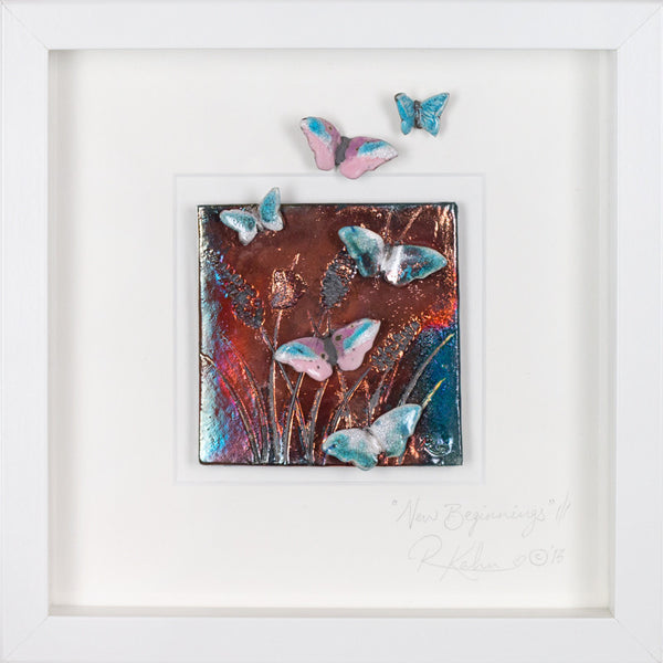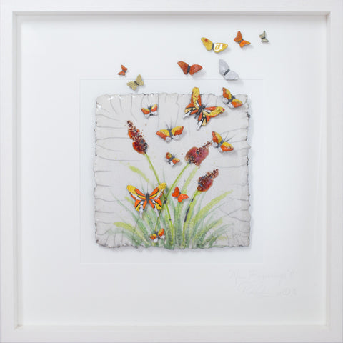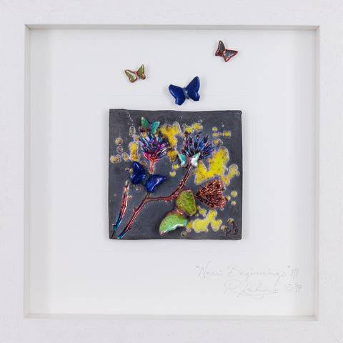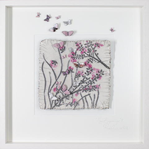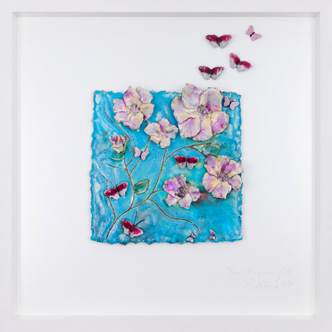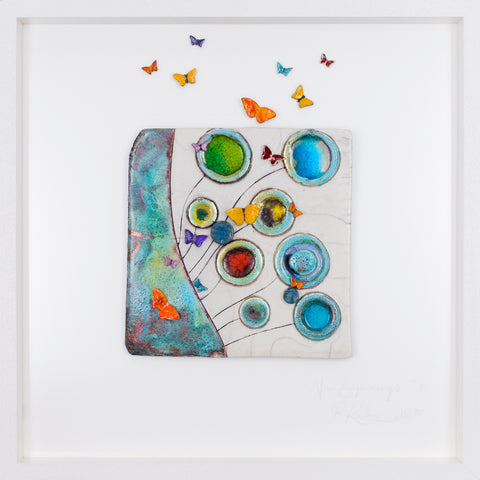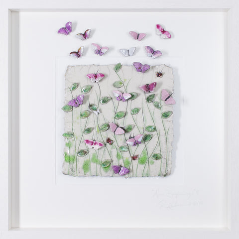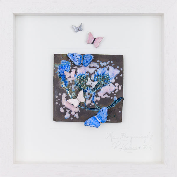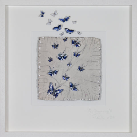 A very pretty, delicate piece with a soft mix of blues, metallics and white butterflies.