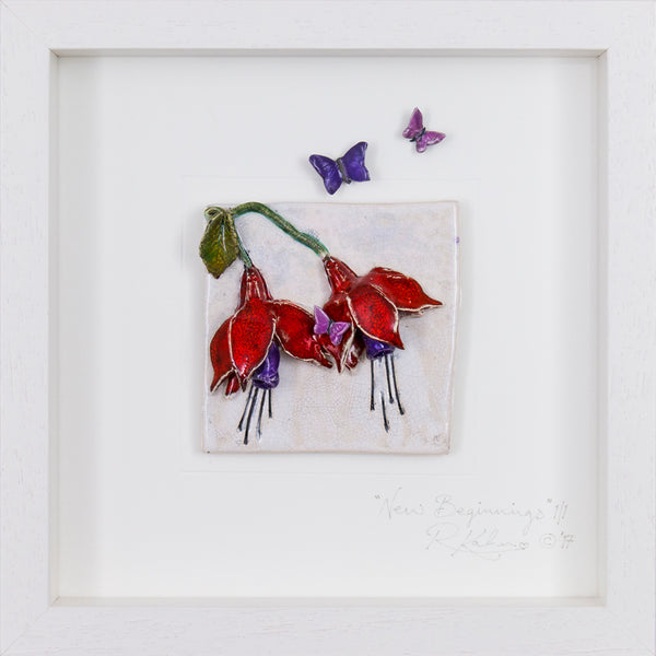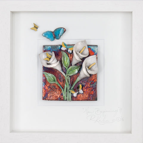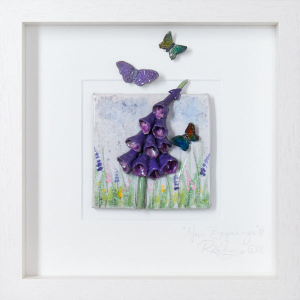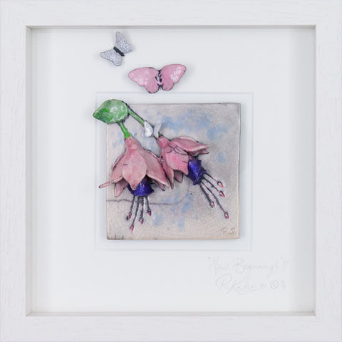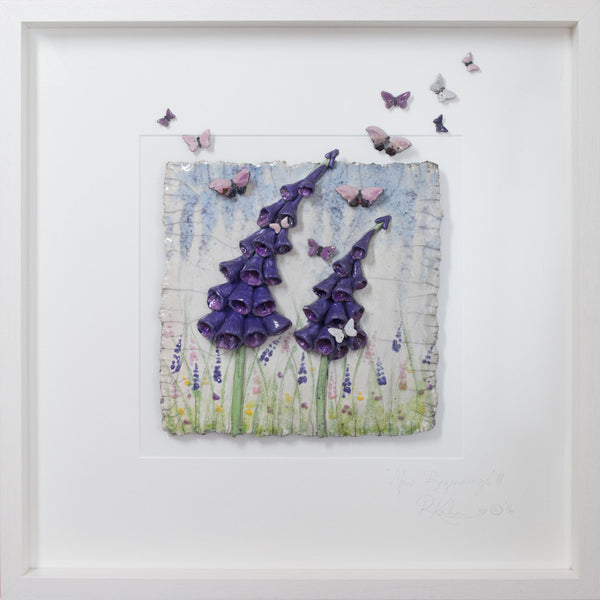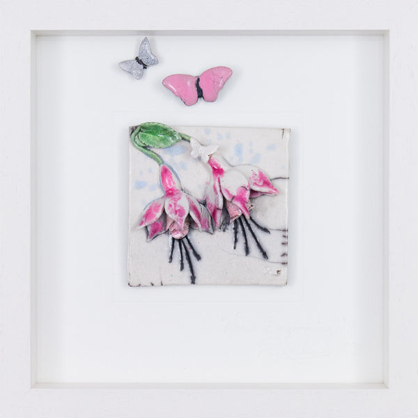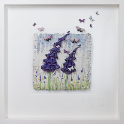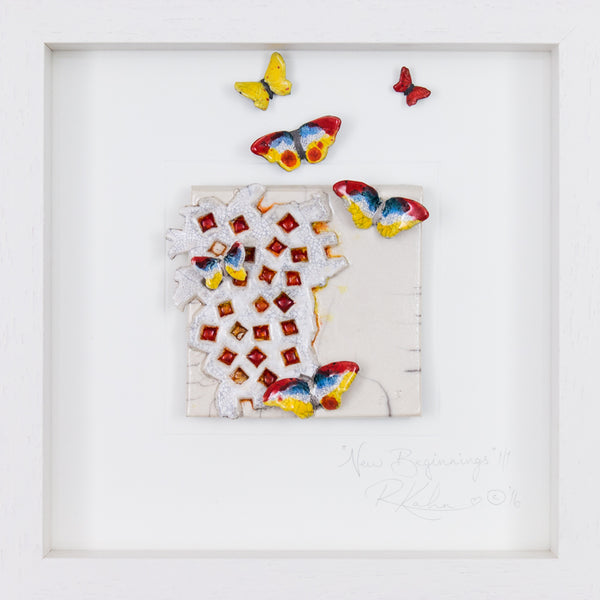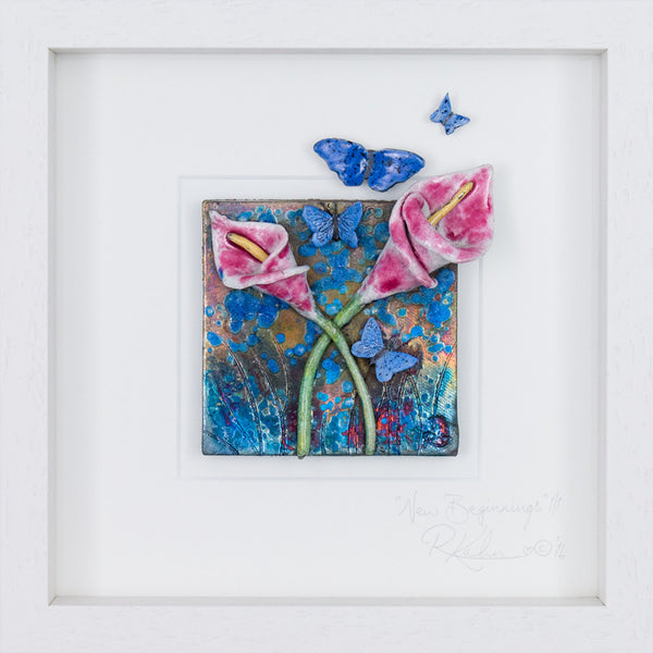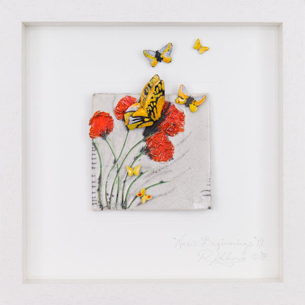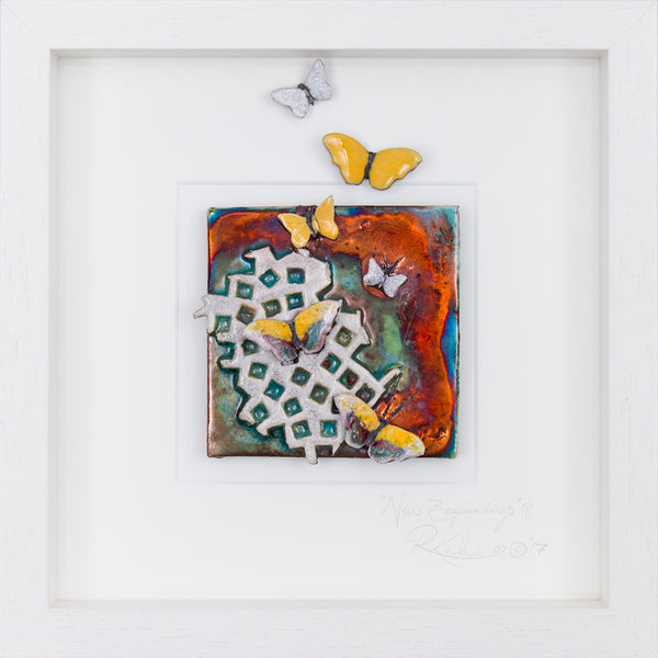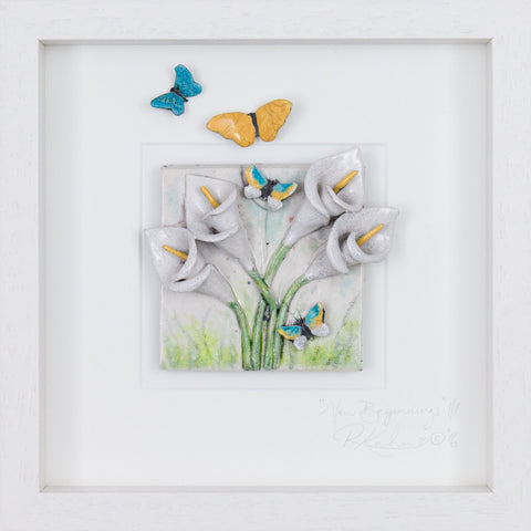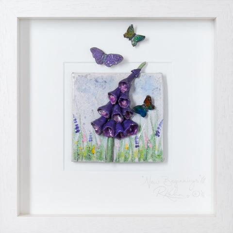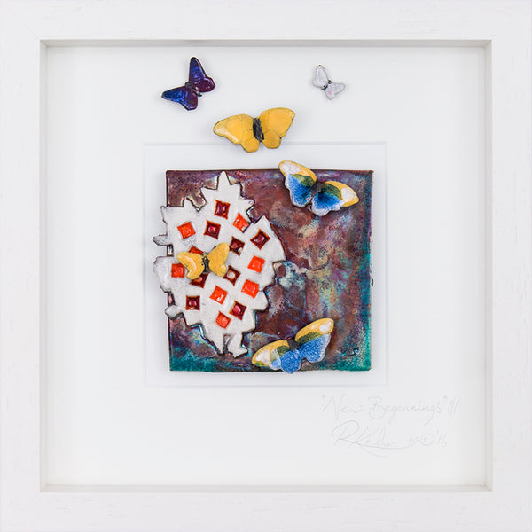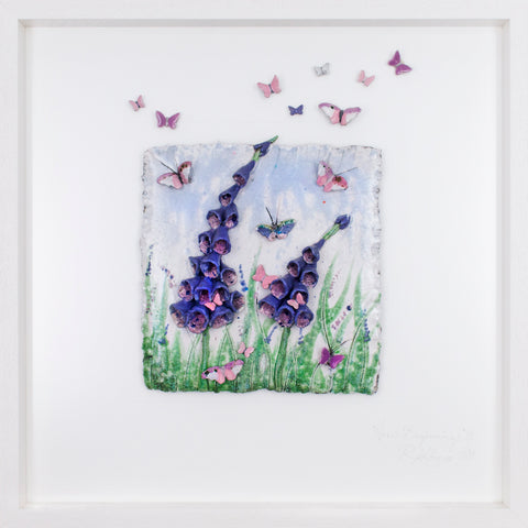 A very pretty, delicate piece with a soft mix of blues, metallics and white butterflies.
