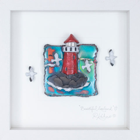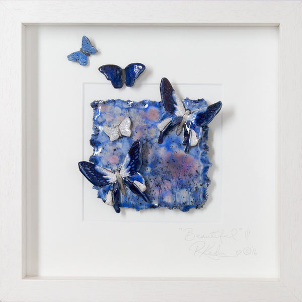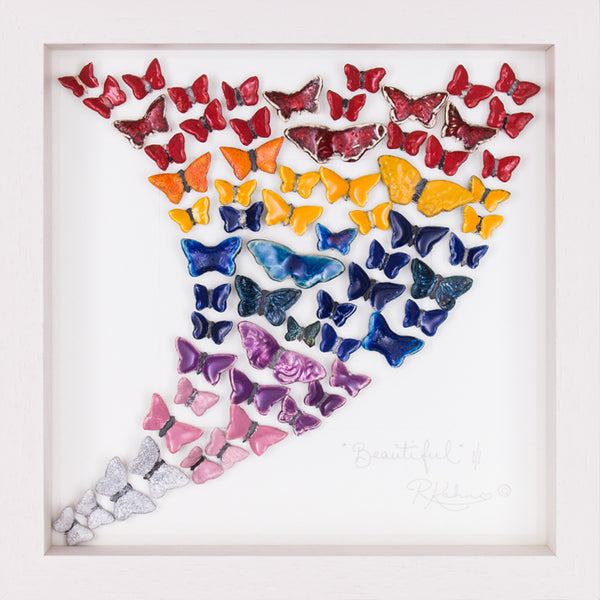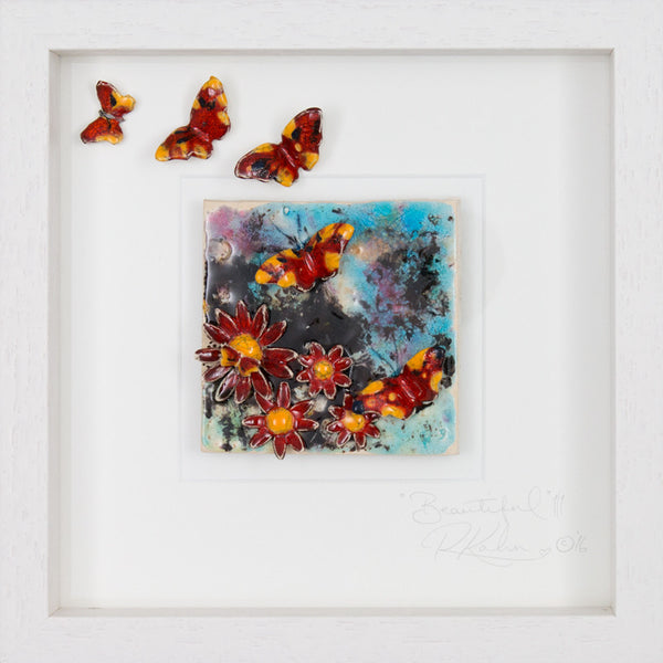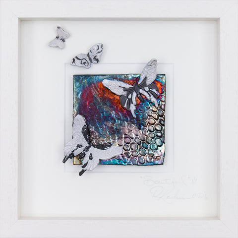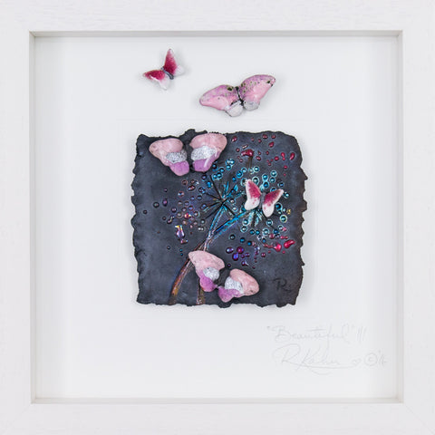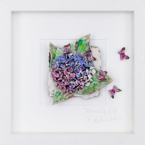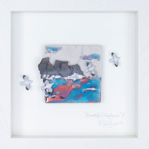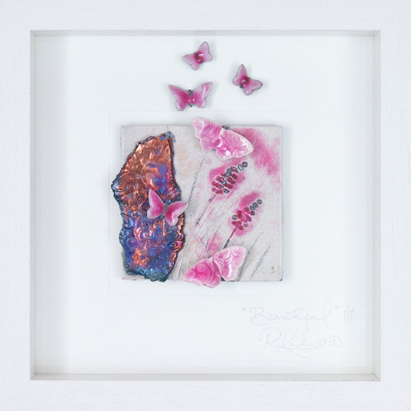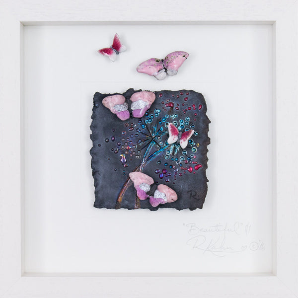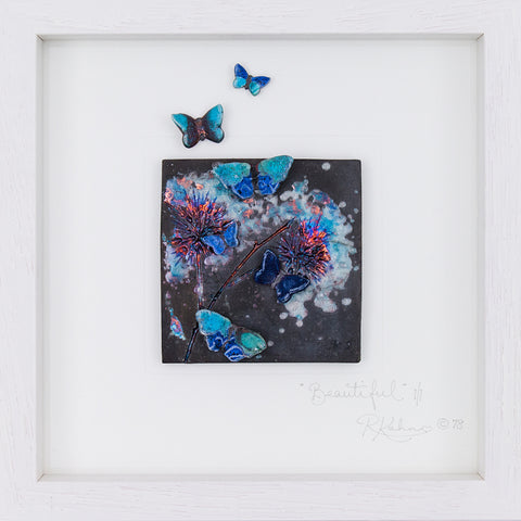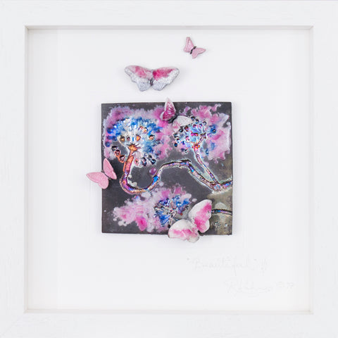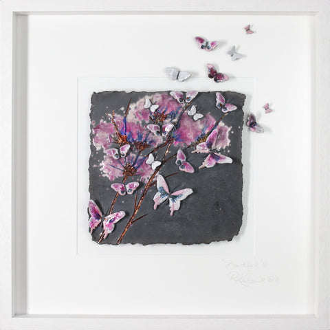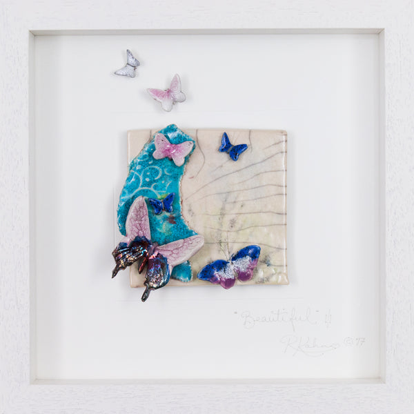 This piece has the most stunning array of pinks and multiple colours in it's oil slick metallics on a truly 'PURE' raku fired background! To me this is what raku is all about! Where the smoke penetrates the clay during the firing, to give these wonderful matt slate, greys and soft black finish! With all of it's colours this piece will very easily work with any colour scheme!