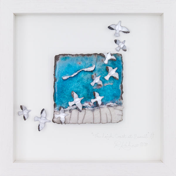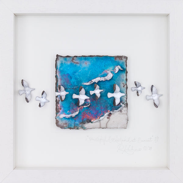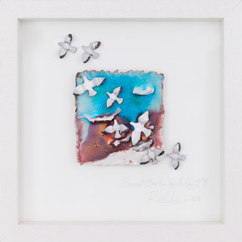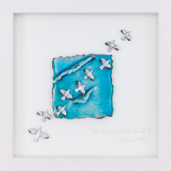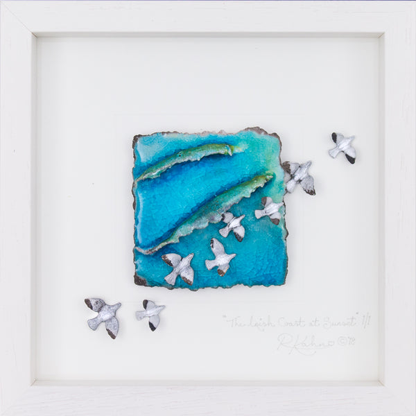This piece portrays our stunning, rugged coastline! With turquoises, blues, greens and hints of metallic reflections as the sunset kisses the water. Always reminds me of my favourite beach as a child.