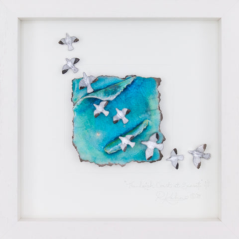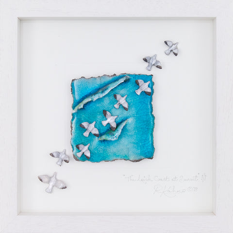 This piece portrays the stunning, rugged coastline of our beautiful Ireland! With turquoises, blues, greens and hints of metallic reflections as the sunset kisses the water. Always reminds me of my favourite beach as a child.