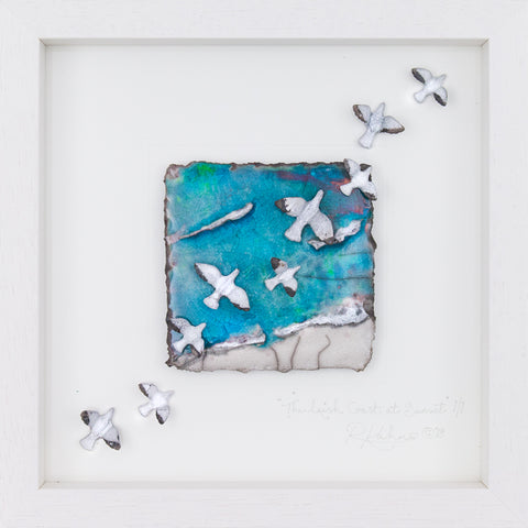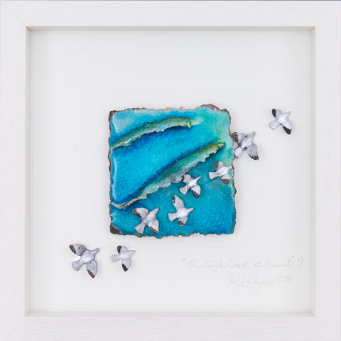 This piece portrays A stunning, rugged coastline ! With turquoises, blues, greens and hints of metallic reflections as the sunset kisses the water. Always reminds me of my favourite beach as a child.