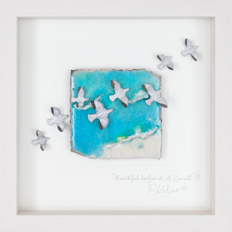 This piece portrays the stunning, rugged coastline of our beautiful Ireland! With turquoises, blues, and tiny hints of metallic reflections as the sunset kisses the water. May remind you of your favourite beach as a child...