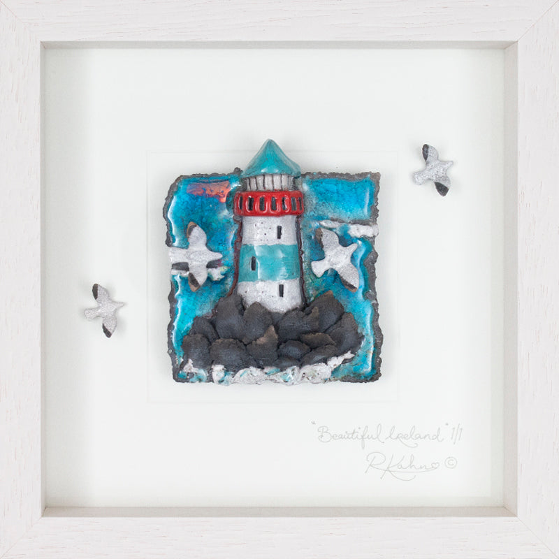 This piece depicts our stunning rugged Irish coastline with its crashing seas and one of its many quaint lighthouses that trim the fringes of our beautiful isle! The perfect interpretation of your favourite spot along the wild Atlantic way, the north, east or south coast....wherever your fond memories may be. Raku fired ceramic and glass framed wall art piece.