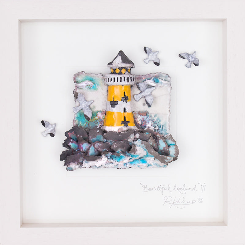 This piece depicts our stunning rugged Irish coastline with its crashing seas and one of its many quaint lighthouses that trim the fringes of our beautiful isle! The perfect interpretation of your favourite spot along the wild Atlantic way, the north, east or south coast....wherever your fond memories may be. Raku fired ceramic and glass framed wall art piece.