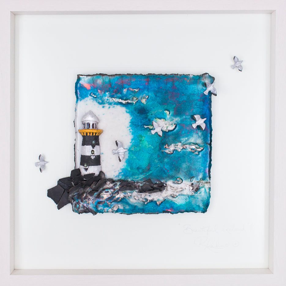 This piece depicts our stunning rugged Irish coastline with its crashing seas and one of its many quaint lighthouses that trim the fringes of our beautiful isle!