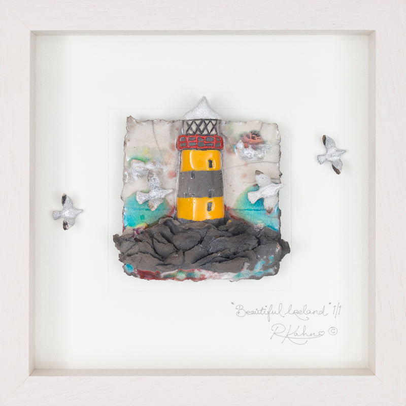 This piece depicts our stunning rugged Irish coastline with its crashing seas and one of its many quaint lighthouses that trim the fringes of our beautiful isle! The perfect interpretation of your favourite spot along the wild Atlantic way, the north, east or south coast....wherever your fond memories may be. Raku fired ceramic and glass framed wall art piece.