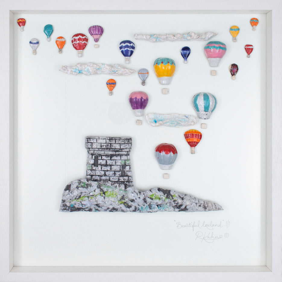 This piece depicts our stunning Irish landscape with its lush green rolling hills as well as some of our whimsical circular Martello towers which are dotted in abundance across our beautiful coastline.