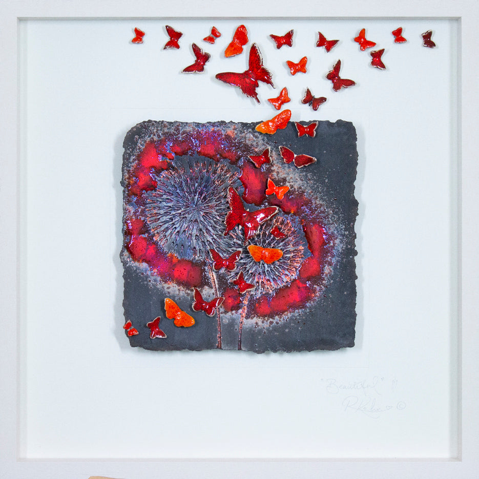 From my "PURE Collection" this piece has the most amazing little details in a rainbow of dreamy oil slick metallics, merged with so many shades of warm, vibrant and dramatic red against my 'PURE' raku slate grey and soft black backgrounds! The colours will change throughout the day as the lighting changes!
