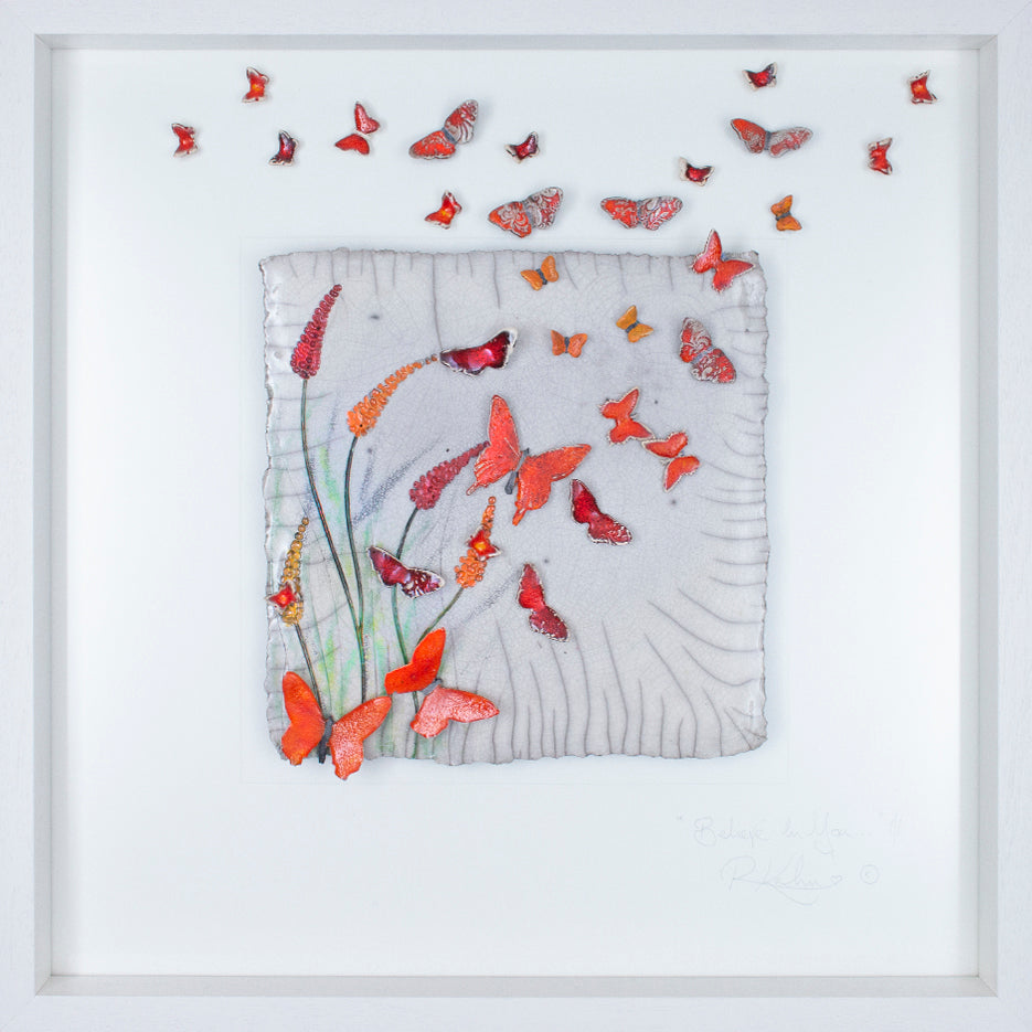 Vibrant 'happy' red and orange, sunset coloured butterflies with textures giving an almost 'vintage' feel, cascading in flight against a wild flower meadow background. An energetic, lively piece sure to lift anyone's spirits and be a wonderful focal point in any room!