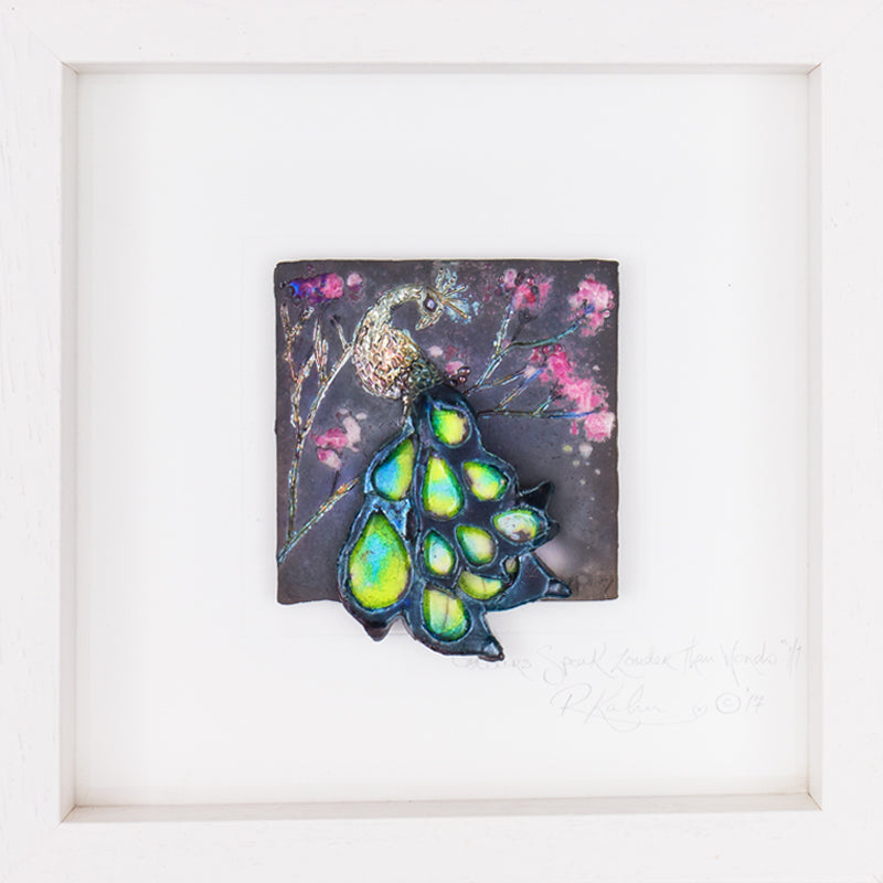 This peacock piece has great movement in it's stunning 3D tail! A real focal point in any room with a beautiful array of colours in it's metallics as well as it's dreamy blend of fused glass to portray the stunning and powerful colours of the majestic peacock!
