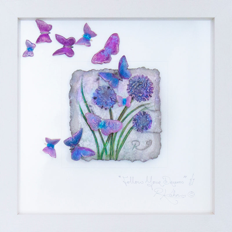 Mauve, lilac and pinks, with little touches of turquoise in a pretty allium meadow. A wonderfully feminine piece.. bursting with positivity, femininity and calm...