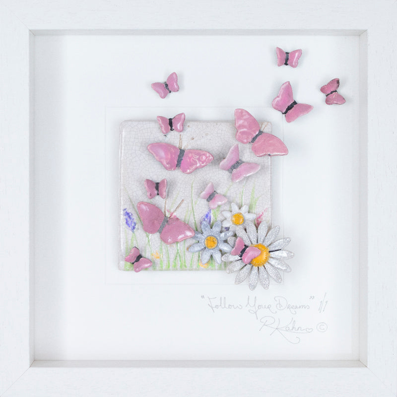 Feminine, pinks and lavender butterflies, with delicate touches of fresh white wild daisies, in a wild flower meadow, portraying 'Follow Your Dreams'...