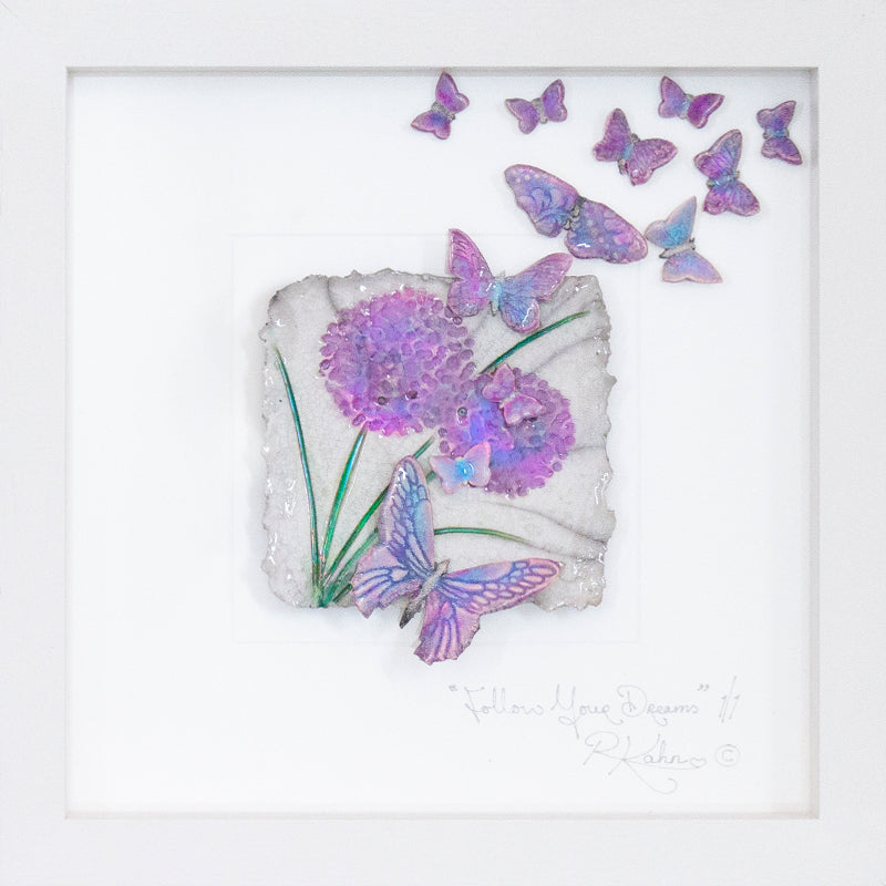 Mauve, lilac and pinks, with little touches of turquoise in a pretty allium meadow. A wonderfully feminine piece.. bursting with positivity, femininity and calm...