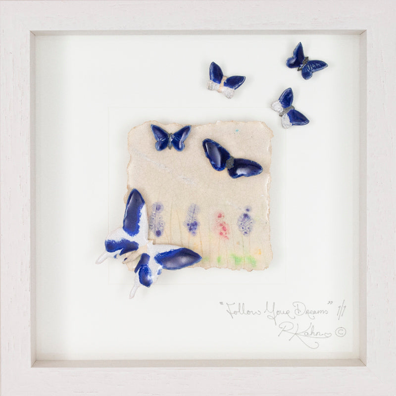 Mellow, calming, dreamy blues and touches of lavender and pink wild meadow flowers in this piece portraying a wonderful message 'Follow Your Dreams'.
