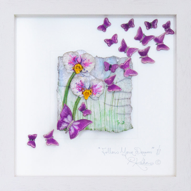 Purple, lilac and deep pink orchids, with lush purple butterflies. A wonderfully feminine piece.. bursting with positivity, femininity and calm...