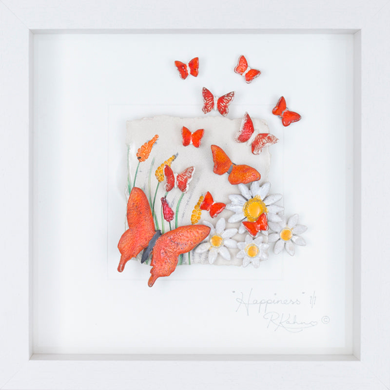 Vibrant, happy, warm sunset orange butterflies, in a wild flower meadow and pretty daisies... a wonderful blast of colour for any room... just bursting with 'Happiness'..