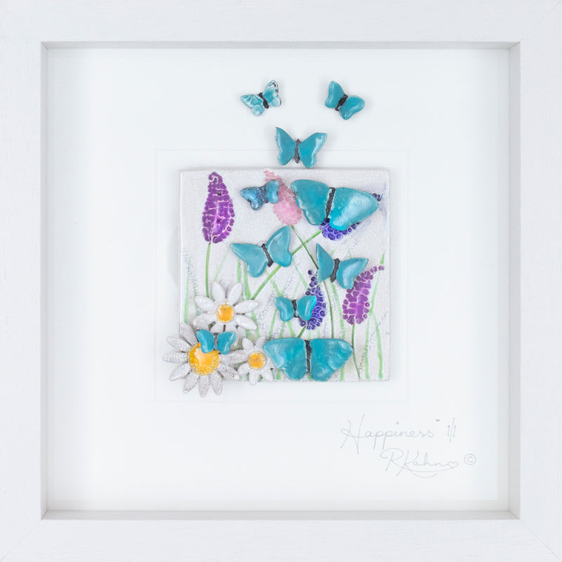 A wild flower backdrop with daisies and a stunning burst of turquoise butterflies, just bursting with the feeling of ...'Happiness'...