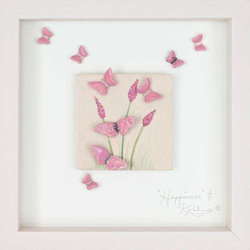 Mellow, calming, feminine pinks with touches of soft deep pink and lavender in this piece portraying a wonderful message 'Happiness'.