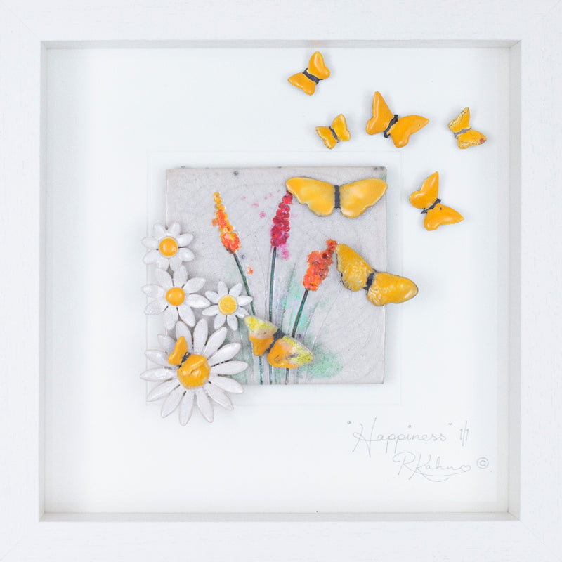 Vibrant, happy, warm sunset yellow butterflies, in a wild flower meadow and pretty, wild daisies... a wonderful blast of colour for any room.