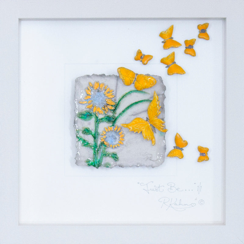 Vibrant yellow butterflies, in a slightly abstract, wild sunflower meadow...on my NEW design backdrop (much more 3D!!) giving a wonderful extra depth to the piece. A wonderful blast of colour for any room, carrying the simple message to "Just be..."....as we don't always have to be 'doing' something, some times it is good to just 'be'.