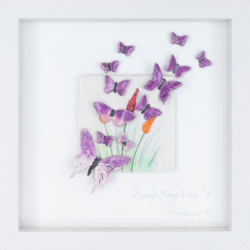 Feminine, purple and pink butterflies, in a wild flower meadow... a wonderful dreamy piece...with the little reminder to 'Laugh Every Day'....because it's good for the soul!