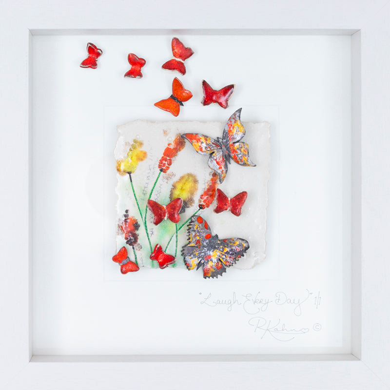 Vibrant, happy, warm sunset yellows and orange butterflies, in a wild flower meadow, a wonderful blast of colour for any room.....with the very encouraging message of 'Laugh Every Day'.....because it's so very GOOD for the soul!!!