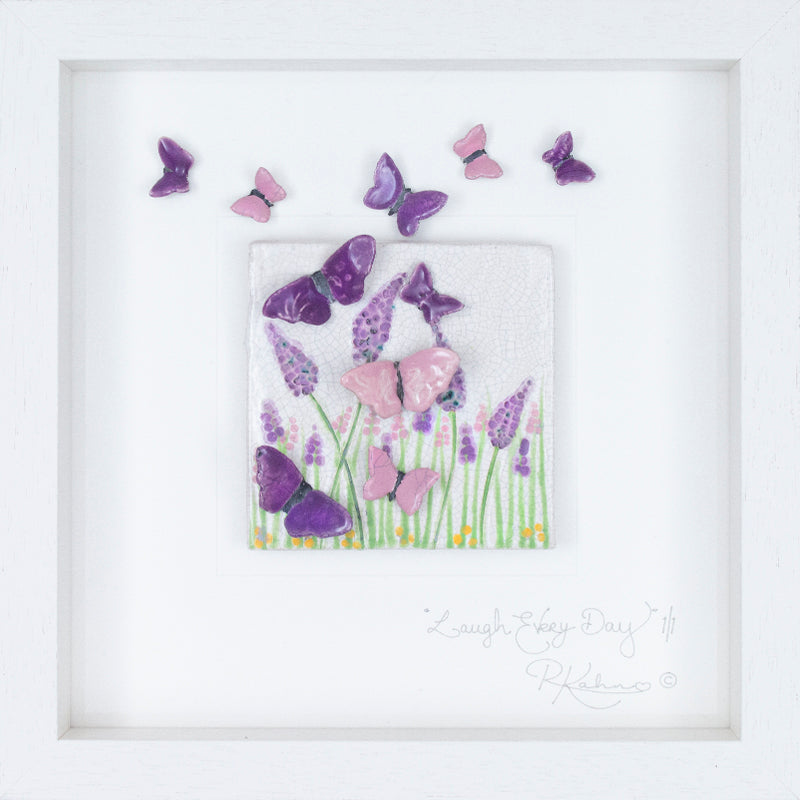 Feminine, lavender, purples and pink, in a wild flower meadow, in this piece portraying a wonderful message, 'Laugh Every Day'...because that's what keeps us all young!