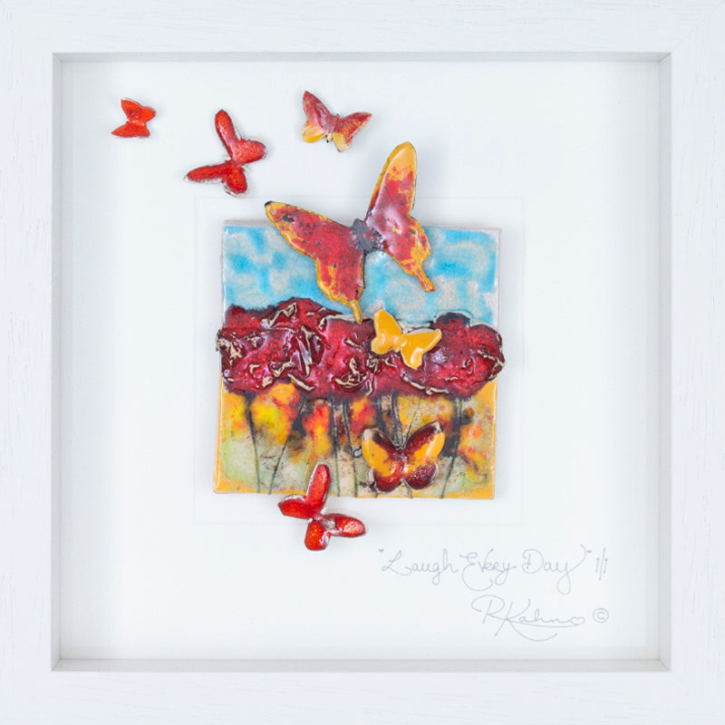Vibrant, happy, warm sunset red and yellow butterflies, in a wild poppy meadow and ... a wonderful blast of colour for any room carrying an important message.