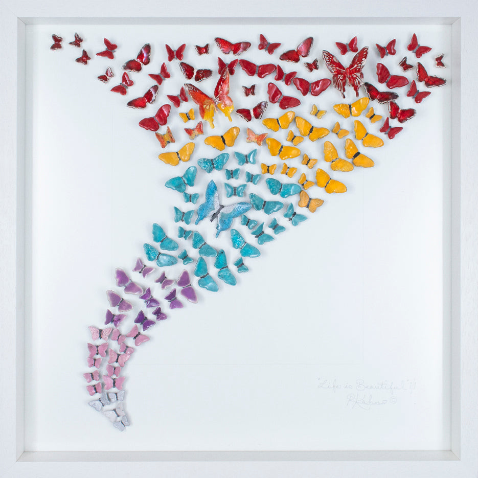 A mesmerising array of multicoloured butterflies blending from one colour to the next like a rainbow!