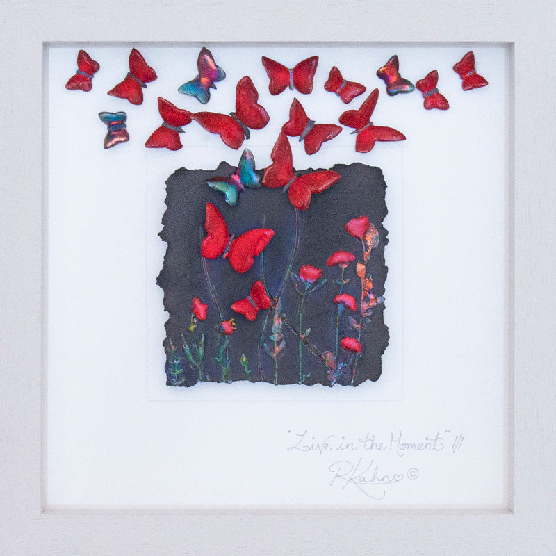 Luxurious, rich red butterflies...on my NEW design backdrop which is much more three dimensional, giving a wonderful extra depth to the piece...with beautiful little metallic details, a wonderful rich blast of colour for any room.