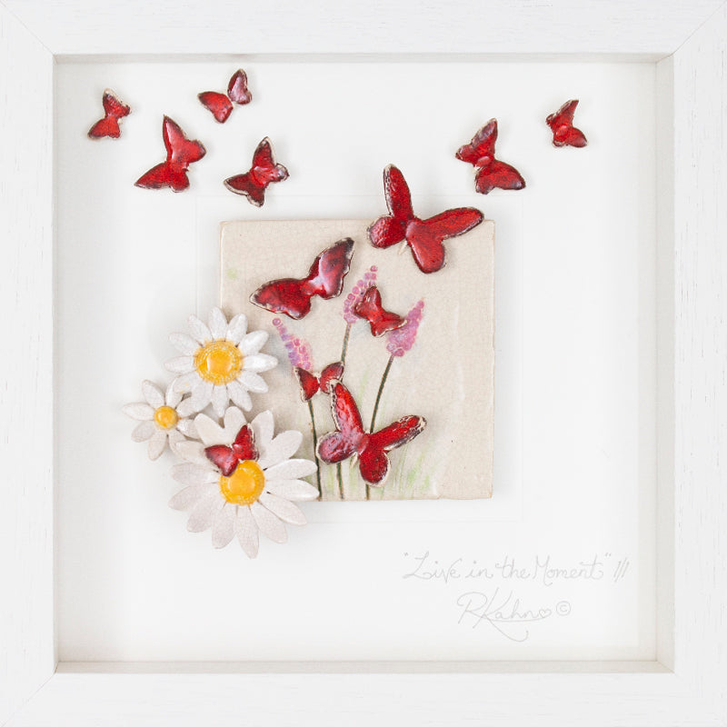 Feminine, lavender with delicate wild daisies in a wild flower meadow array of stunning rich red butterflies in this piece portraying a wonderful message, 'Live in the Moment'. Sometimes we all need to just stop and take in all the natural beauty around us... Why not pair it with another piece? CLICK HERE to see our favourite suggestion!
