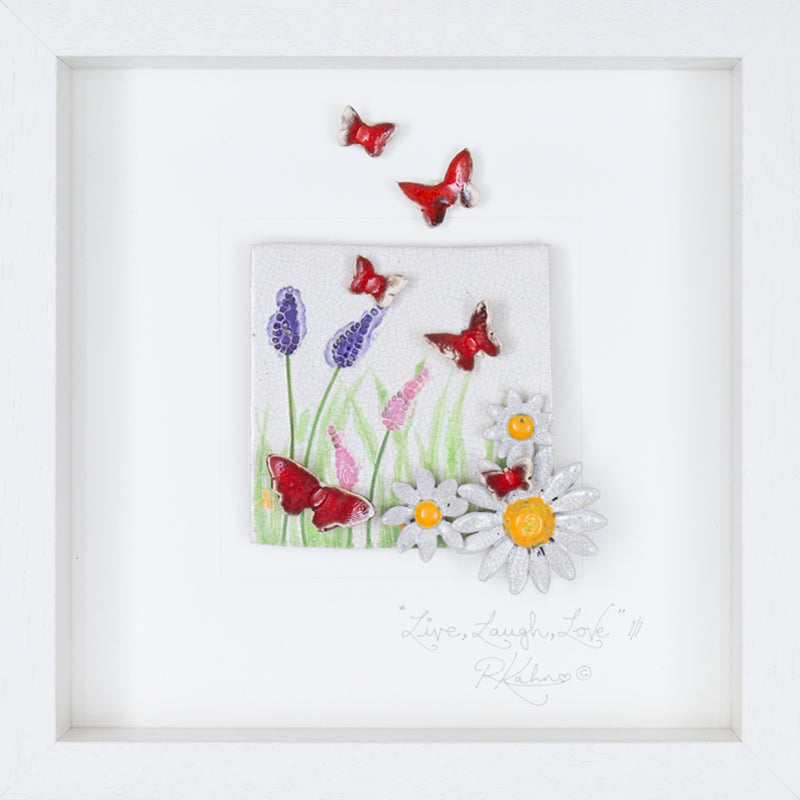 Butterflies in rich red, in a wild flower meadow and delicate daisies, in this piece portraying a wonderful message, 'Live, Laugh, Love'...
