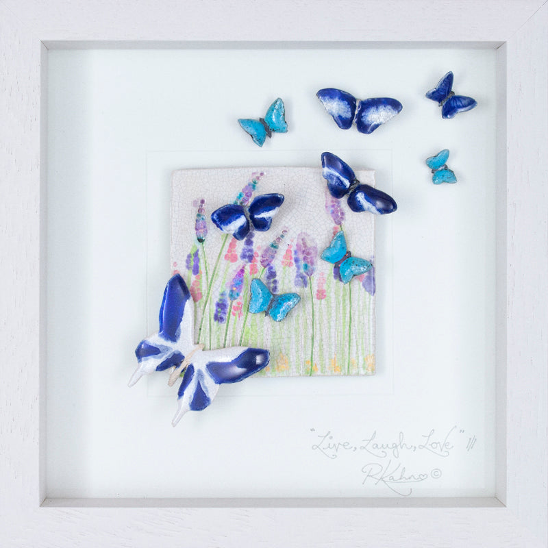 Feminine, wild lavender, purples and pink, with delicate turquoise and blue butterflies in a wild flower meadow, portraying the very simple yet important message "Live, Laugh, Love"...