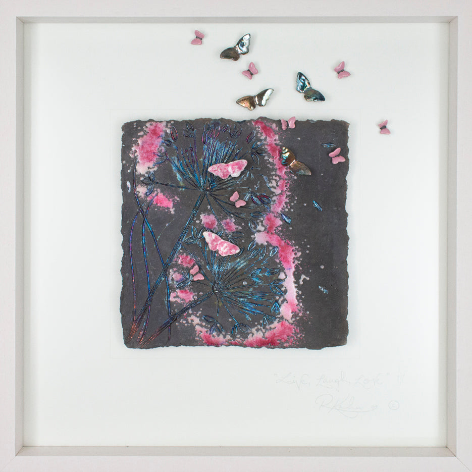 From my "PURE Collection" this piece has the most amazing little details in dreamy oil slick metallics, merged with so many shades of pinks and a hint of blues against my NEW PURE raku slate grey and soft black backgrounds! Raku fired ceramic and glass framed wall art piece.