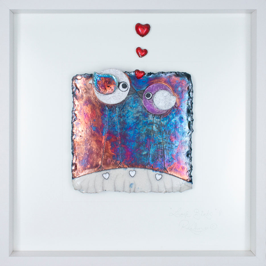 The perfect sentiment for an engagement, wedding, new home ...or just to say 'I Love you!'. This particular piece has the most amazing backdrop in a rainbow of metallic colours that will change as you move and as the lighting changes throughout the day. I have also used my NEW EVEN MORE 3D hearts! Raku fired ceramic and glass framed wall art piece.