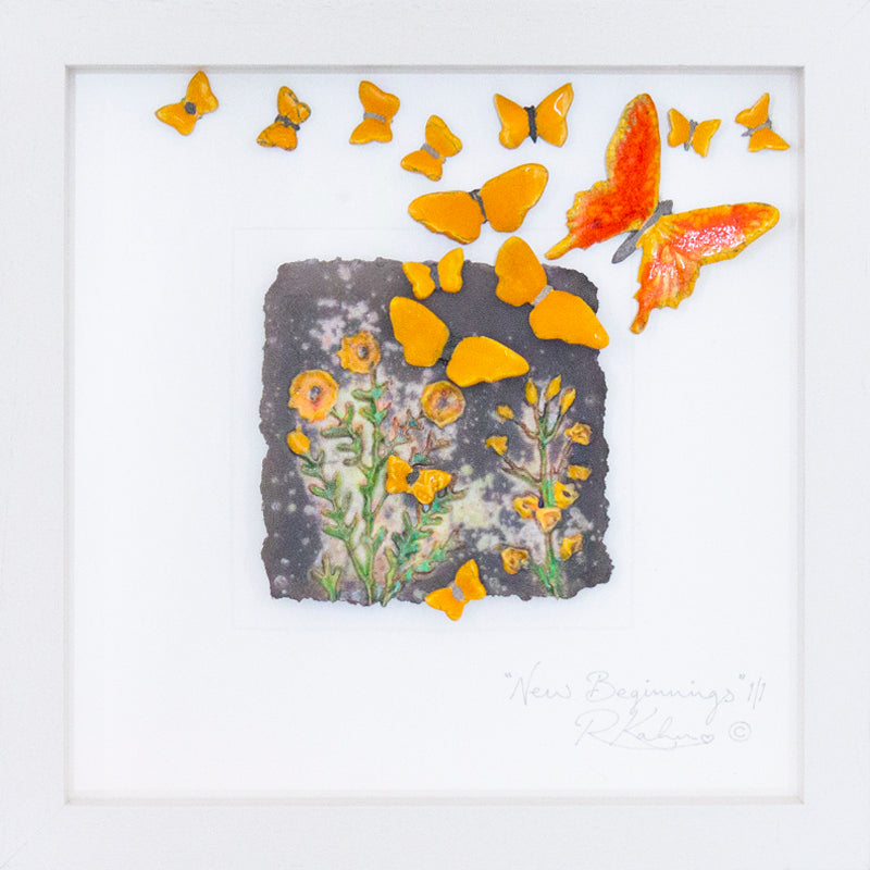 Vibrant, happy, sunshine yellow butterflies and one with fiery orange, on a pretty, wild flower meadow, NOW A LOT MORE 3D! giving so much more depth to the piece... a wonderfully warming piece....oozing the feeling of joy and optimism!"