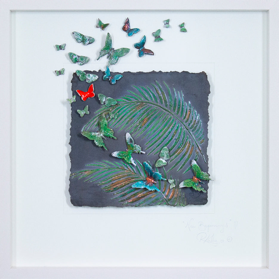 This is a very new design! With my new stunning background of ferns which are now much more three dimensional, adding so much more depth to the piece. A flurry of butterflies in greens and white, with hints of beautiful metallics merged with so many shades of striking turquoise and greens against my PURE raku slate grey and soft black background! A truly striking, yet calming piece for any room!