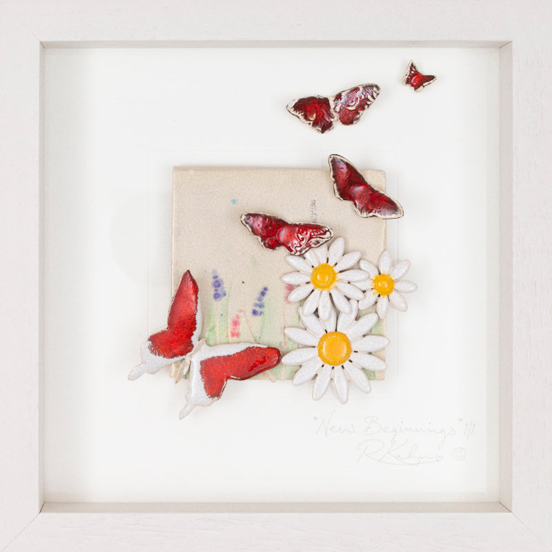 Vibrant red and yellow with delicate wild daisies in a wild flower meadow, in this piece portraying a wonderful message 'New Beginnings'.