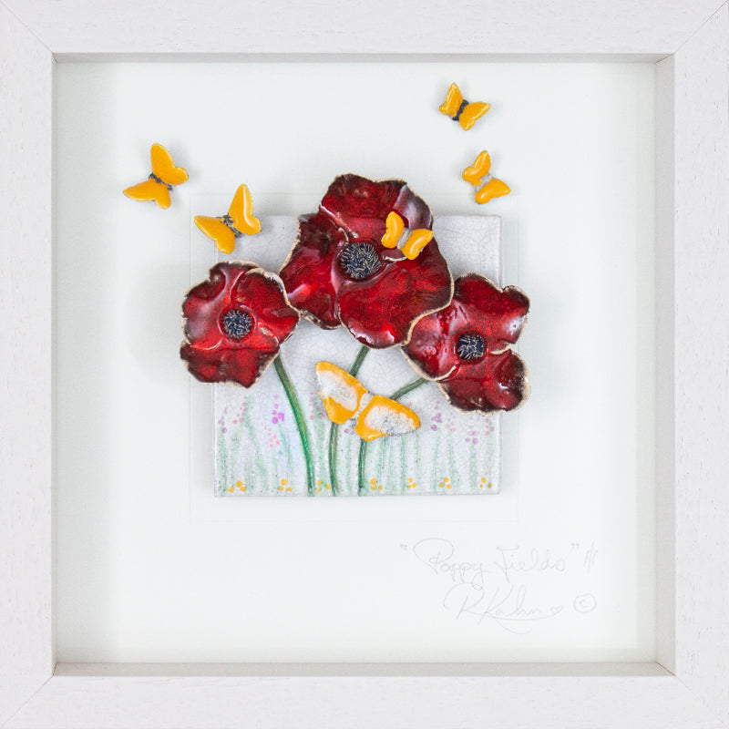 Vibrant deep red poppies! in a meadow with delicate, dreamy, butterflies. Raku fired ceramic and glass framed wall art piece.
