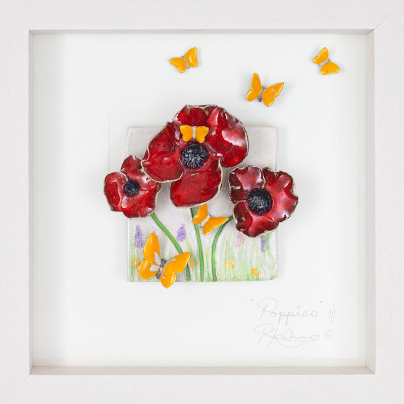 Vibrant deep red poppies! in a meadow with delicate, dreamy, butterflies. Raku fired ceramic and glass framed wall art piece.