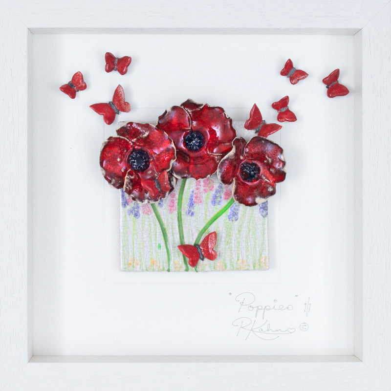Vibrant deep red poppies! In a meadow with delicate, dreamy, butterflies. Raku fired ceramic and glass framed wall art piece.