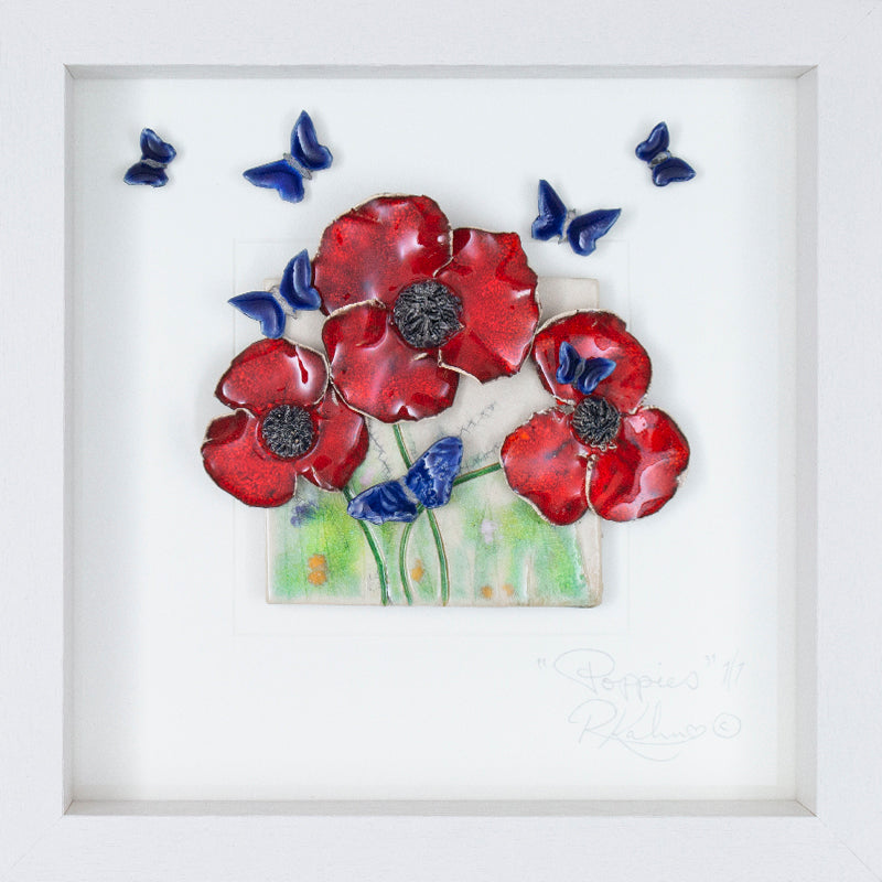 Vibrant deep red poppies! In a meadow with delicate, dreamy, butterflies. Raku fired ceramic and glass framed wall art piece.