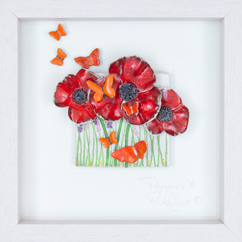 Vibrant deep red poppies! In a meadow with delicate, dreamy, butterflies. Raku fired ceramic and glass framed wall art piece.