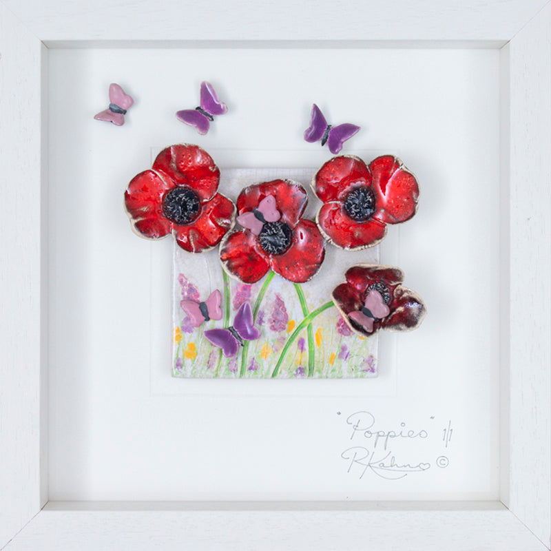 Vibrant deep red poppies! In a meadow with delicate, dreamy, butterflies. Raku fired ceramic and glass framed wall art piece.