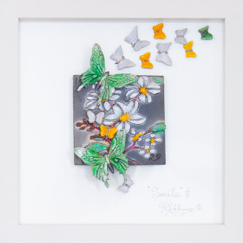 Stunning wild daisies (which are now even more three dimensional!) on a contemporary naked raku, dark grey background. With butterflies in textured greens, sunny yellow and fresh white flying across the piece. Such a piece can only evoke joy and happiness...and make you 'Smile", hence it's title. The perfect sentiment for so many occasions and messages...