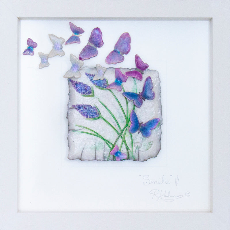 Mauve, lilac and pinks, with little touches of turquoise in a pretty wild heather meadow. A wonderfully feminine piece.. bursting with positivity, femininity and calm... carrying the very simple message...."Smile"...