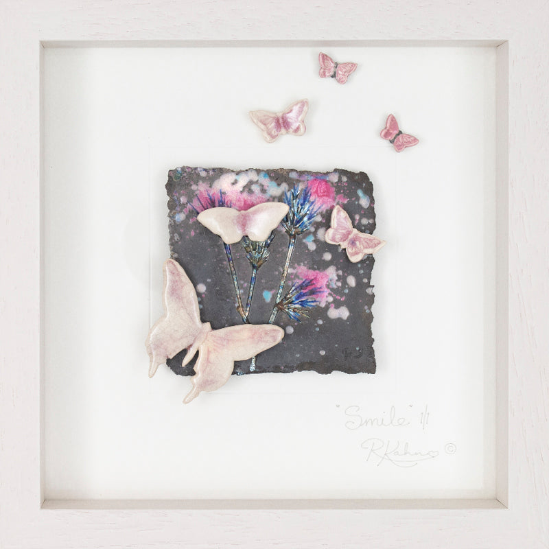 Stunning and dreamy soft and vibrant pinks, delicate oil slick metallics on a truly 'PURE' raku fired background! To me this is what raku is all about! Where the smoke penetrates the clay during the firing, to give these wonderful matt slate, greys and soft black finish!
